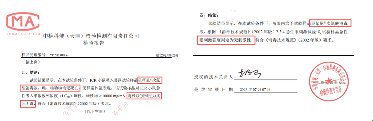 经第三方实验室验证,星帮尼次氯酸消毒液通过了小鼠急性吸入毒性和急性眼刺激实验,结果均为无毒、无刺激级别 ✅。