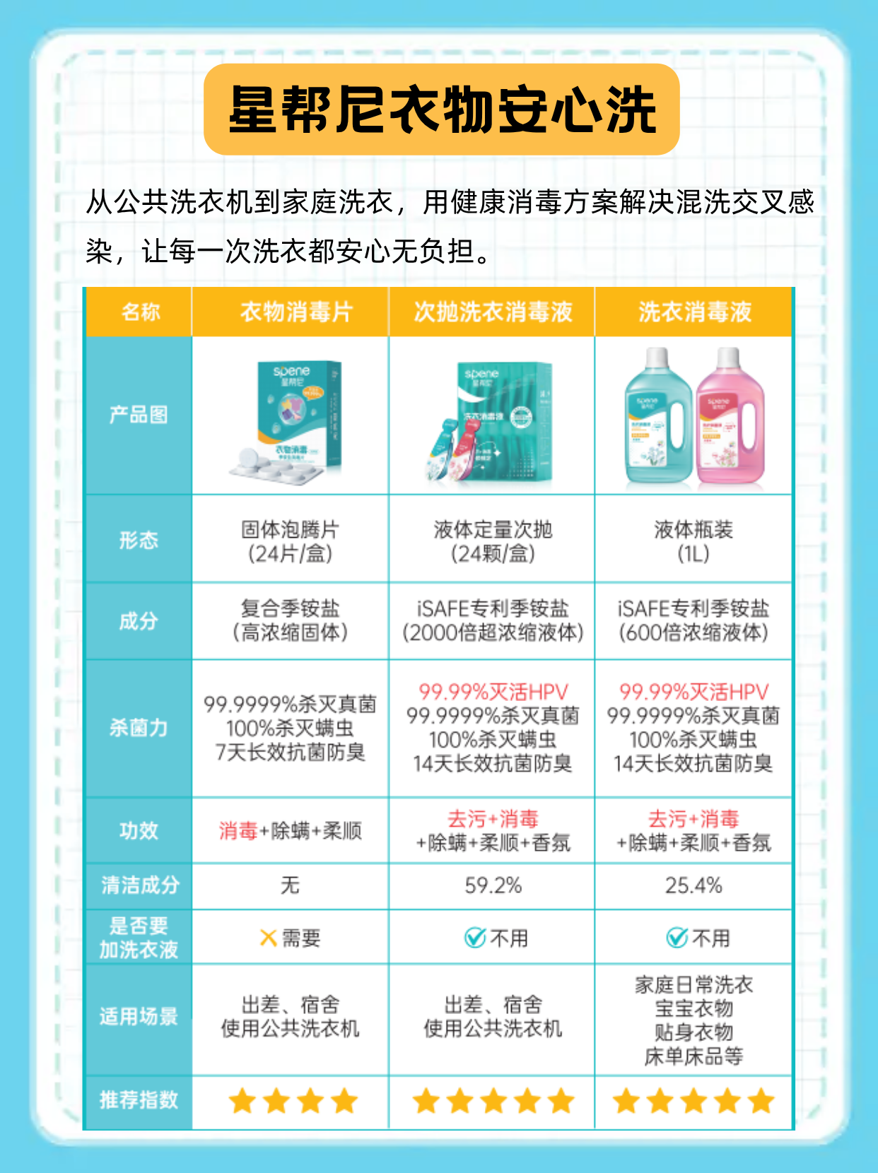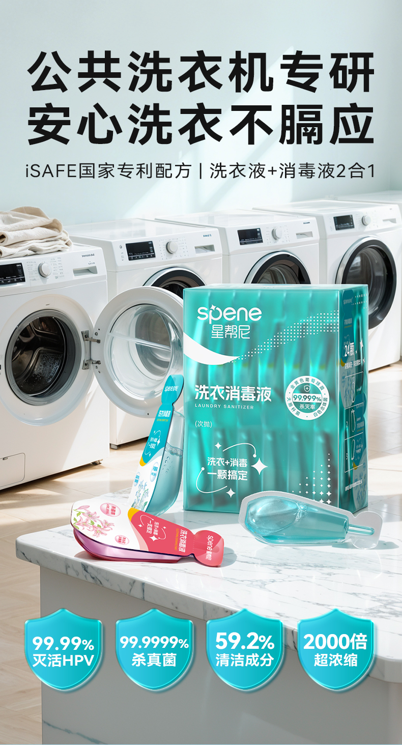 正因如此,星帮尼研发【衣物安心洗】系列产品:从宿舍公共洗衣机到家庭日常洗衣,用科学配方覆盖不同场景,构建洗衣健康防护链。我们希望通过更科学、更安全的衣物消毒方式,让每一位住宿生、上班族、家庭用户的洗衣过程变得轻松、干净、无负担。