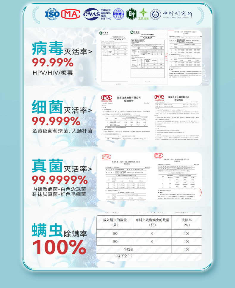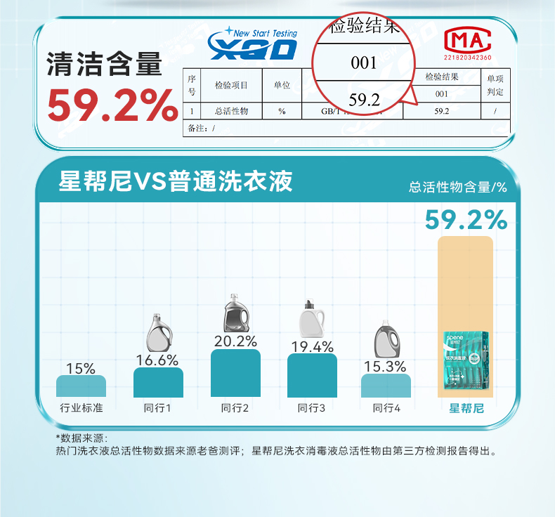 星帮尼次抛采用专利技术配方,实现洗衣液+消毒液二合一功效,使用时不用另外放洗衣液,解决了传统消毒液与洗衣液不能混用的行业难题。同时,2000倍超高浓缩配方确保即使在洗衣机大水量环境中保持有效浓度,实现衣物和洗衣机内桶同步杀菌,经第三方权威检测,可有效灭活包括HPV、红色毛癣菌、大肠杆菌、金黄色葡萄球菌、白色念珠菌等多种常见致病菌。